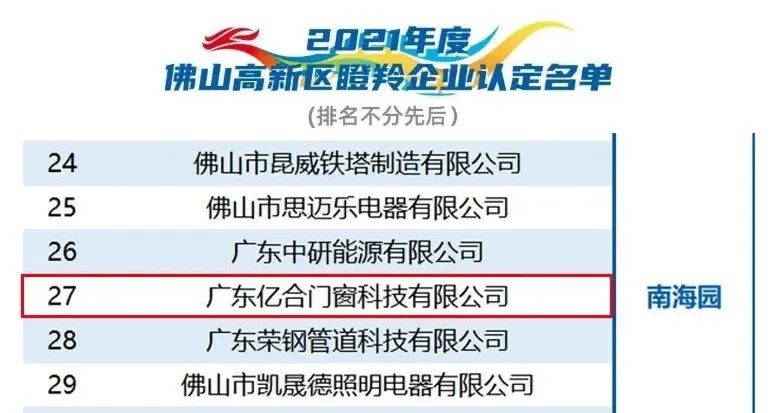 近日,佛山高新區管委會公布了2021年度佛山高新區瞪羚企業認定名單,共有84家企業入選。億合門窗憑借企業綜合效益、卓越創新能力、高質量發展等方面的突出成就成功上榜,榮獲2021年度佛山高新區瞪羚企業認定。