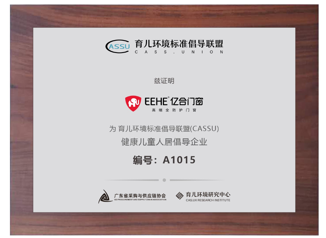 經育兒環境倡導聯盟(CAS)的多項科學數據檢測與權威審核,認證億合門窗品質遠超國標之上,高度符合友好育兒環境產品環保及安全標準,獲頒友好育兒環境產品認證,被評為“健康兒童人居倡導企業”,為兒童健康成長保駕護航。