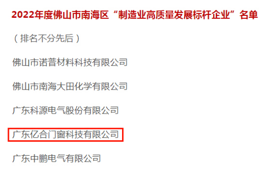 為鼓勵先進,助力企業做強做大做優,大會通報表彰了一批先進制造業企業。億合門窗入選2022年度佛山市南海區“制造業高質量發展標桿企業”,與地方發展同頻共振,為實干耕耘再添碩果。