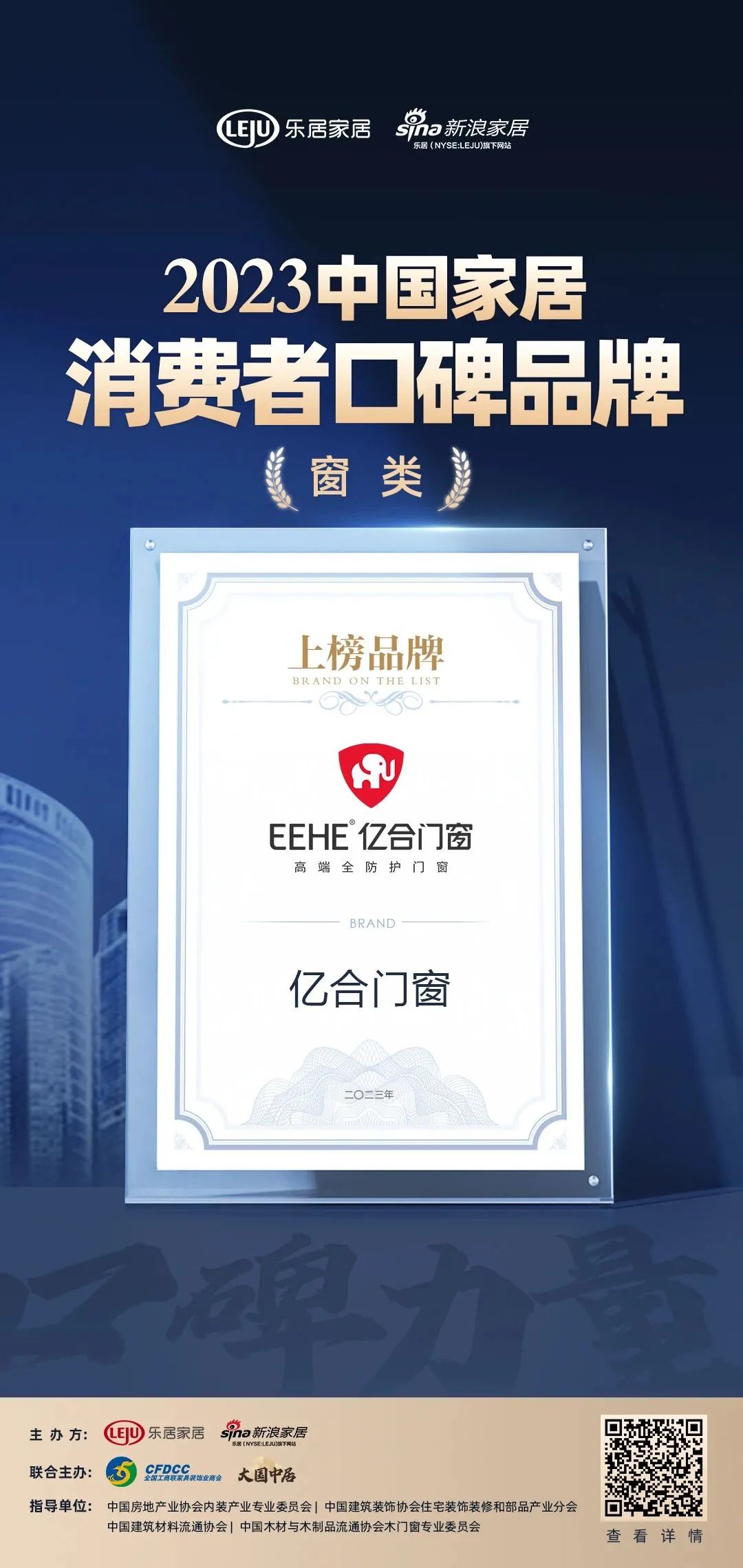 近日,在樂居家居、新浪家居、大國中居、全國工商聯家具裝飾業商會聯合主辦《2023中國家居消費者口碑調查》的活動中,億合門窗憑借卓越的產品品質和良好的信譽口碑榮登“2023中國家居消費者口碑榜”。