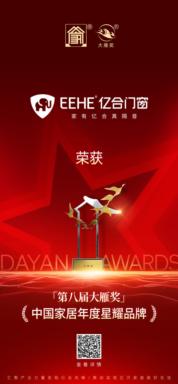 ??作為「第八屆大雁獎——中國家居年度星耀品牌」的獲獎者,億合門窗將持續引領著門窗安裝交付和服務水平更高規格、更高標準的提升。