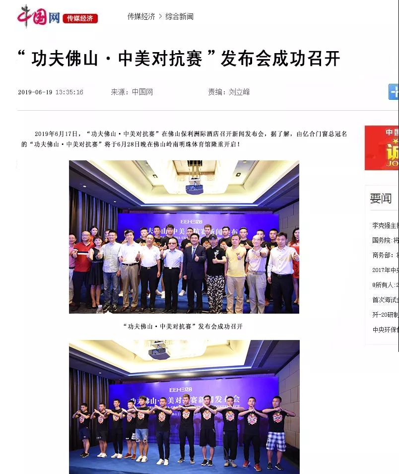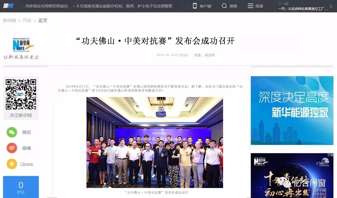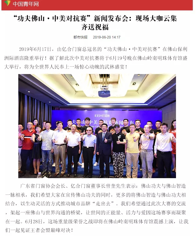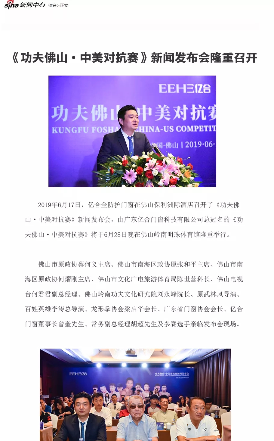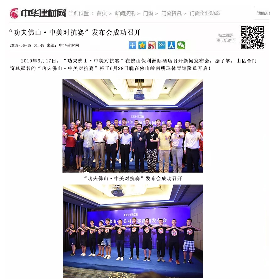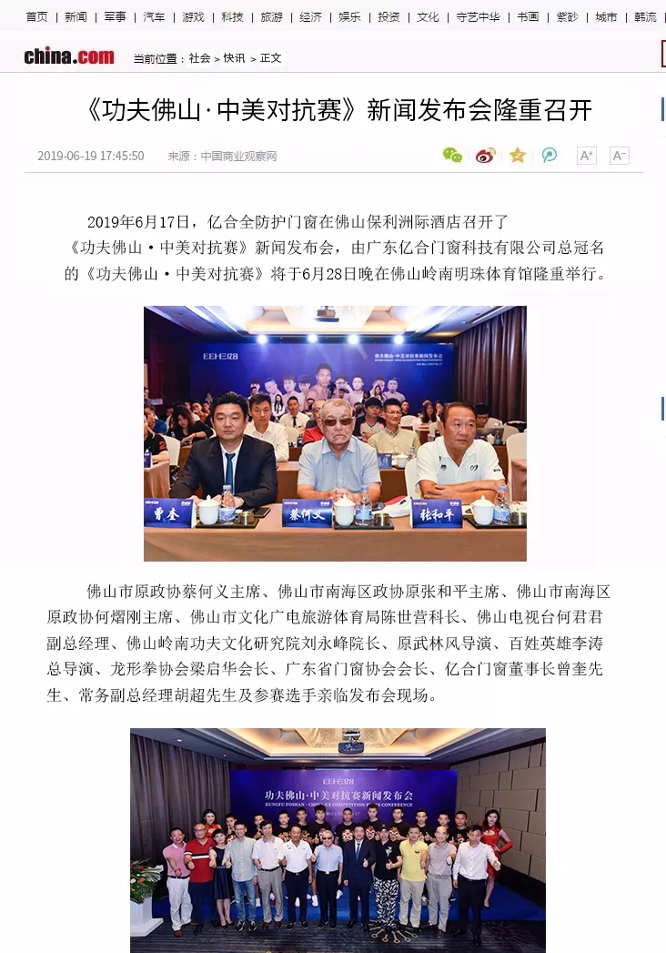 2019年6月17日,億合全防護門窗在佛山保利洲際酒店召開了《功夫佛山·中美對抗賽》新聞發布會,由廣東億合門窗科技有限公司總冠名的《功夫佛山·中美對抗賽》將于6月28日晚在佛山嶺南明珠體育館隆重舉行。此消息一經發布,各大權威媒體爭相報道,引起社會的高度關注。