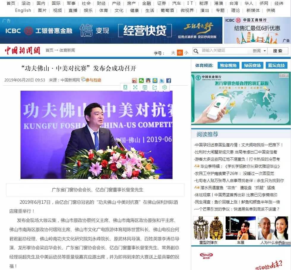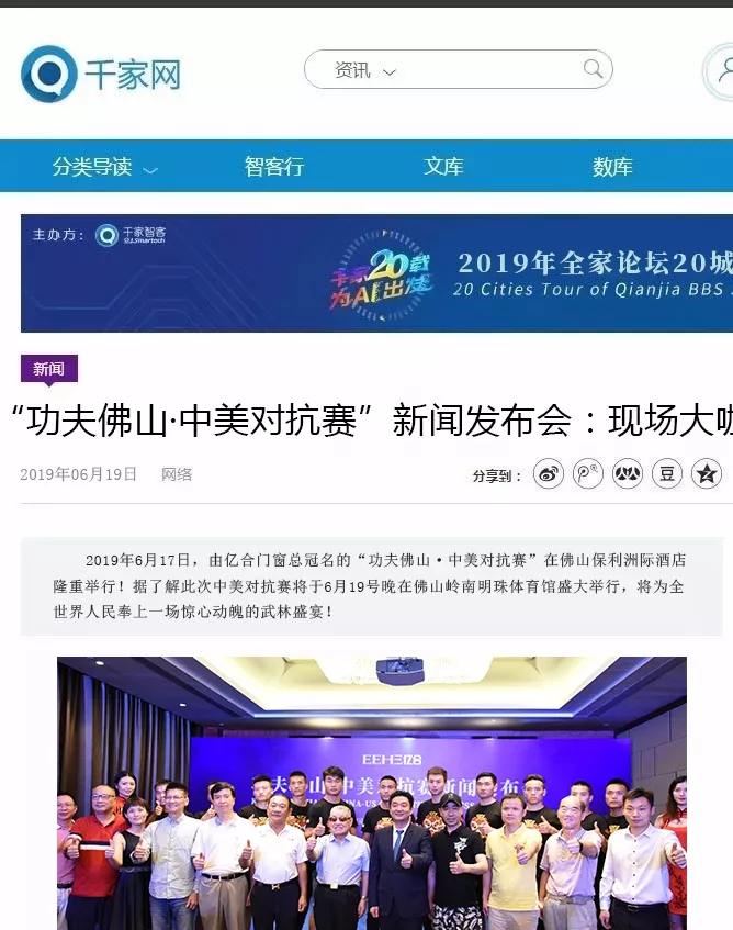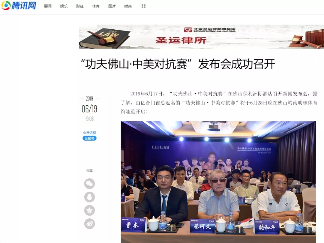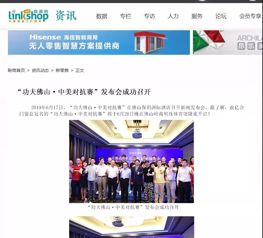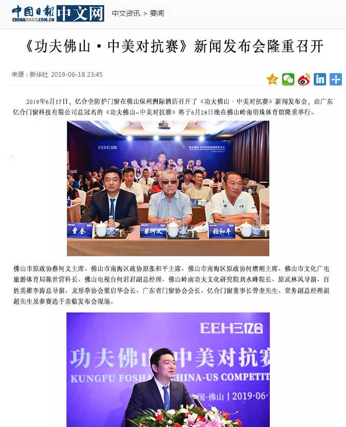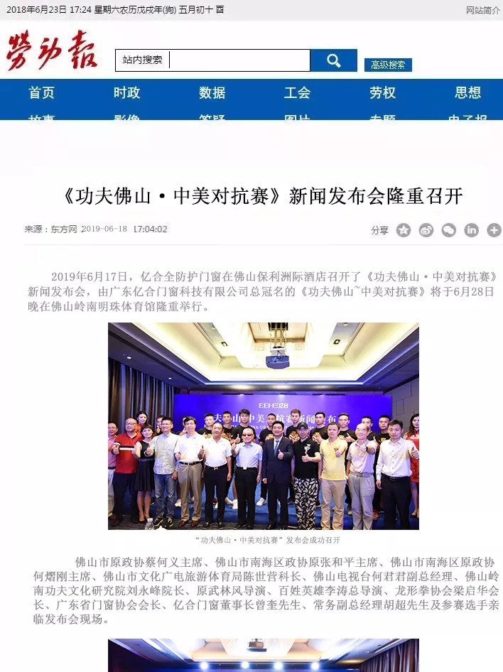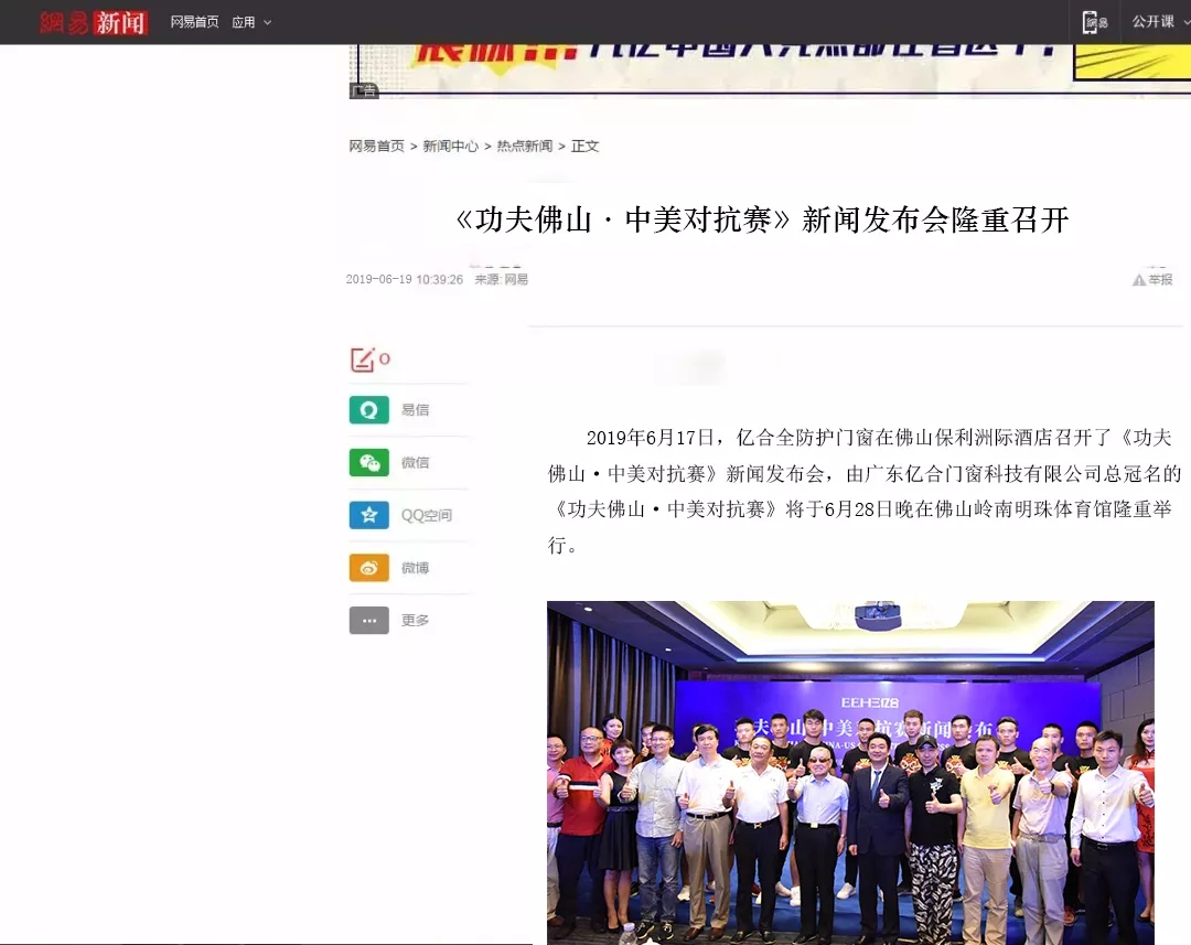 2019年6月17日,億合全防護門窗在佛山保利洲際酒店召開了《功夫佛山·中美對抗賽》新聞發布會,由廣東億合門窗科技有限公司總冠名的《功夫佛山·中美對抗賽》將于6月28日晚在佛山嶺南明珠體育館隆重舉行。此消息一經發布,各大權威媒體爭相報道,引起社會的高度關注。