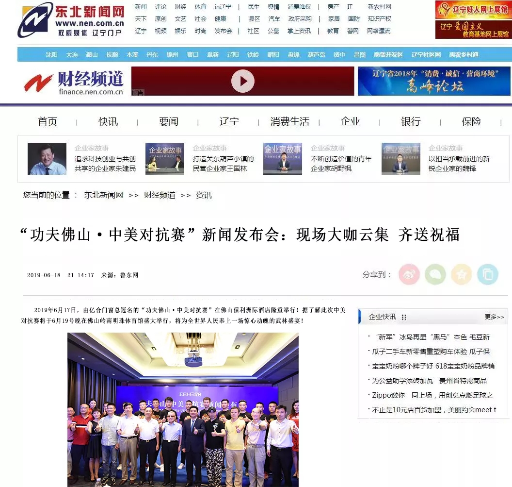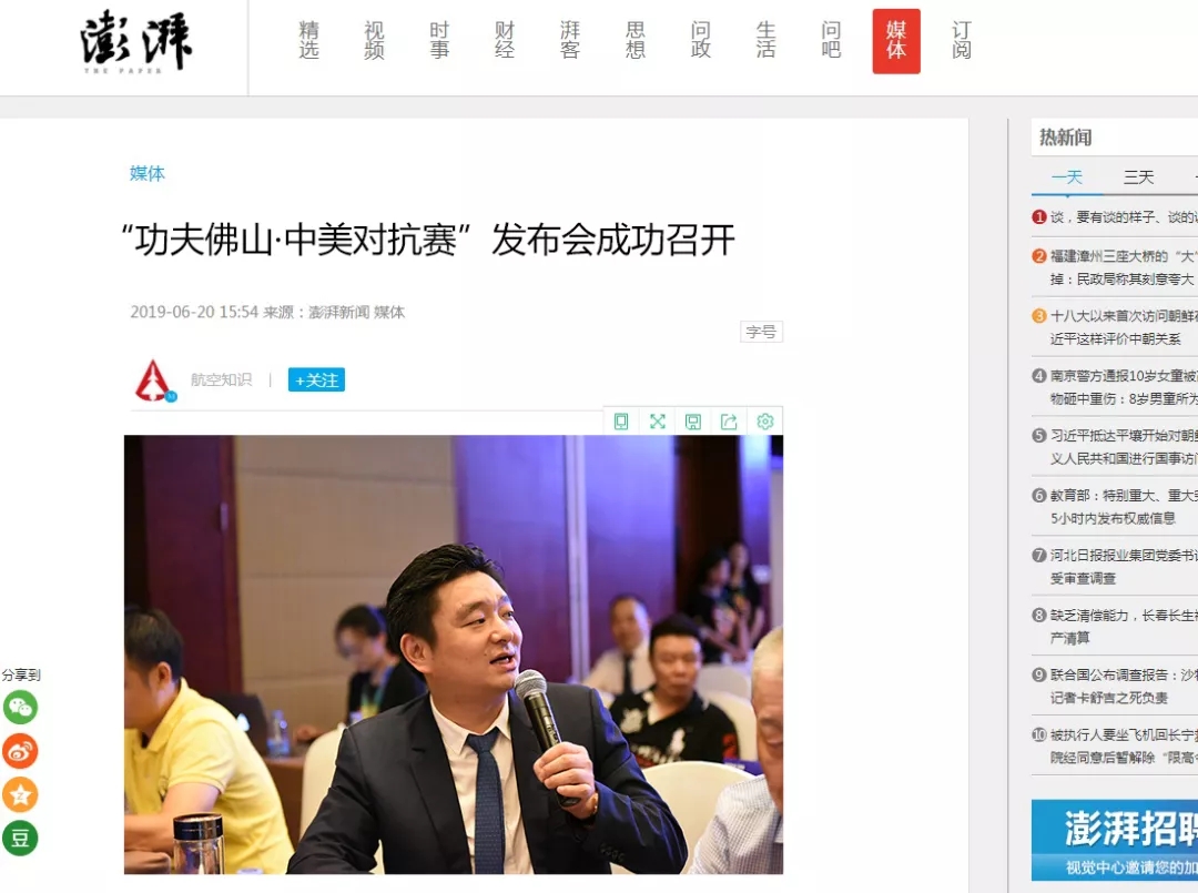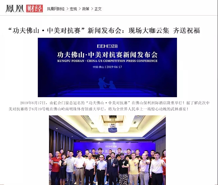 2019年6月17日,《功夫佛山·中美對抗賽》新聞發布會在美麗的千燈湖畔佛山保利洲際酒店隆重召開,正式對外發布6月28日在嶺南明珠體育館隆重舉辦的《功夫佛山·中美對抗賽》相關事宜。