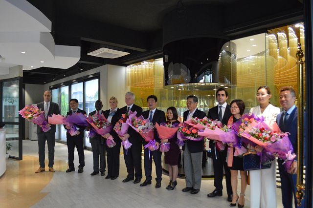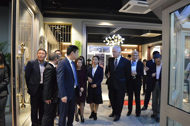 大使一行在鮮花簇?fù)硐聟⒂^了億合門窗展廳。億合門窗精湛的產(chǎn)品設(shè)計工藝、過硬的產(chǎn)品質(zhì)量與豐富的產(chǎn)品線使得大使與參贊們紛紛駐足品鑒。