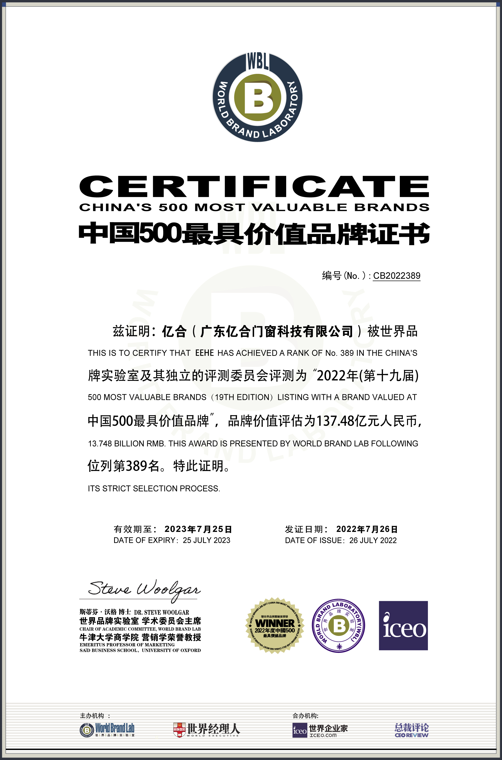 在這份基于品牌強度、財務(wù)數(shù)據(jù)和消費者行為分析的年度報告中,億合門窗以137.48億元品牌價值榮登本年度最具價值品牌389位,這是億合門窗連續(xù)五年邁進(jìn)世界級品牌陣營,也是億合門窗連續(xù)第五次與國家電網(wǎng)、中國工商銀行、海爾、騰訊、中國人壽等品牌共同入選《中國500最具價值品牌》。