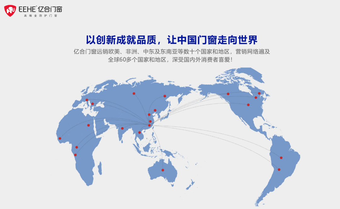 世界門窗看中國,中國門窗看廣東!億合門窗產(chǎn)品已遠(yuǎn)銷歐美、非洲、中東及東南亞等地區(qū),營銷網(wǎng)絡(luò)遍及全球60個國家,深受國內(nèi)外消費者喜愛與信賴!
