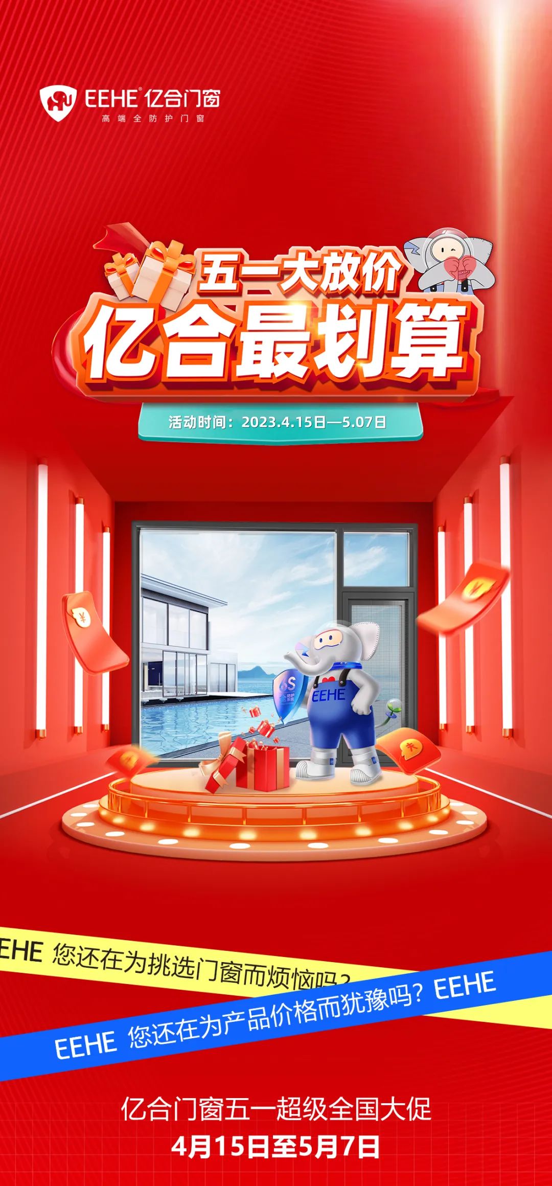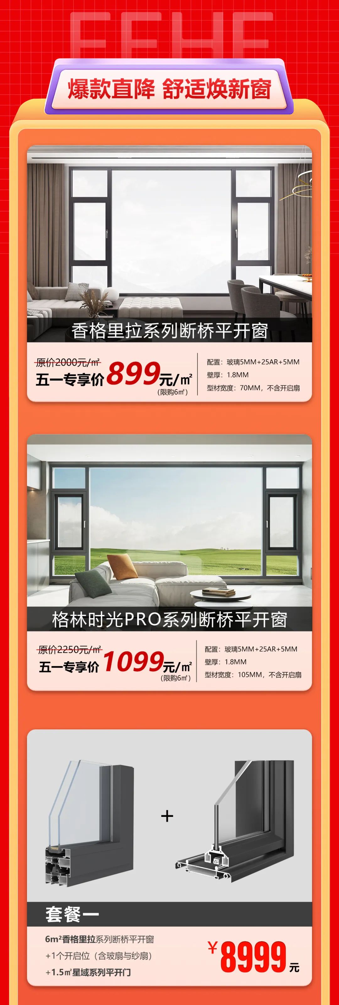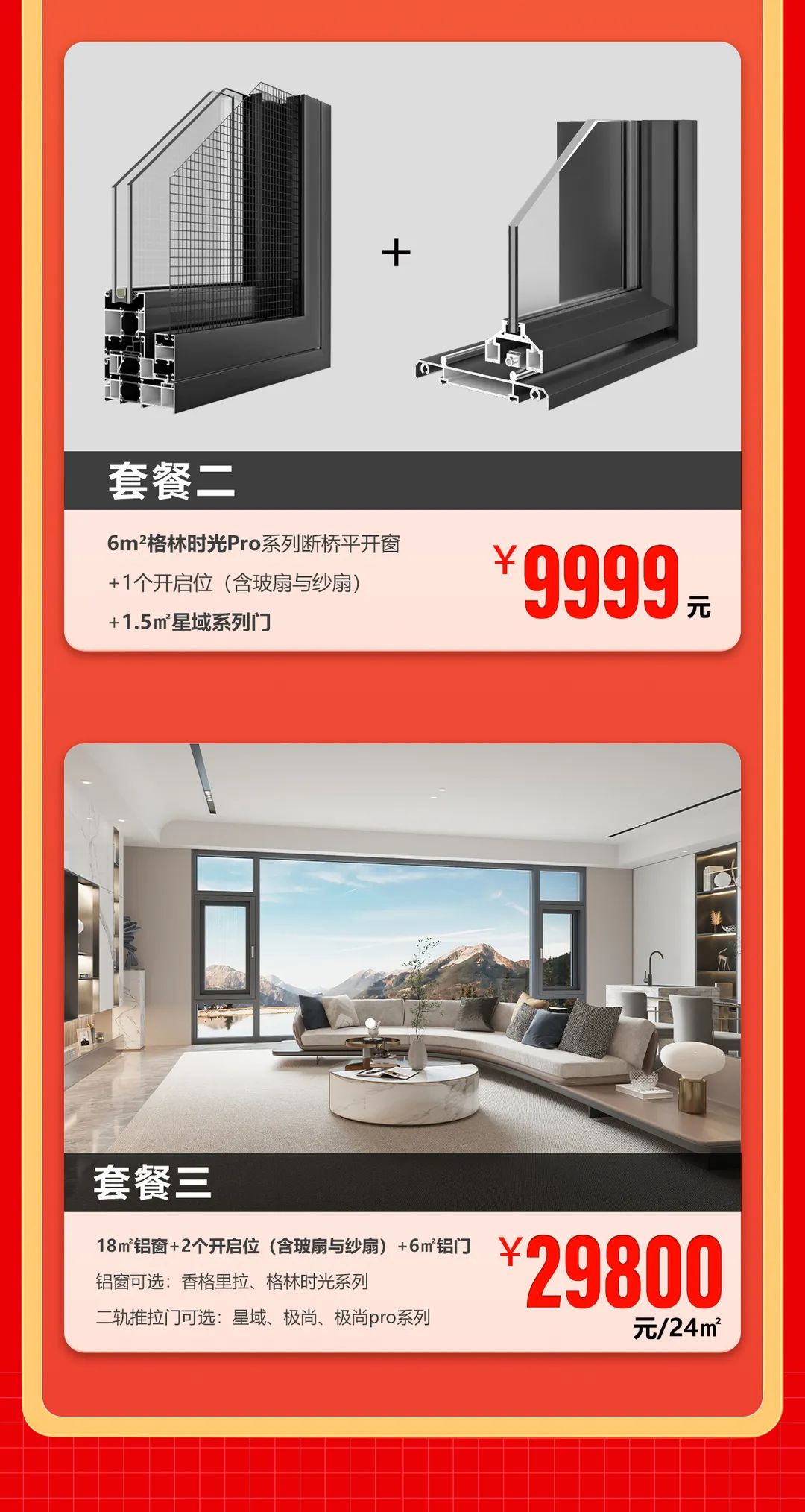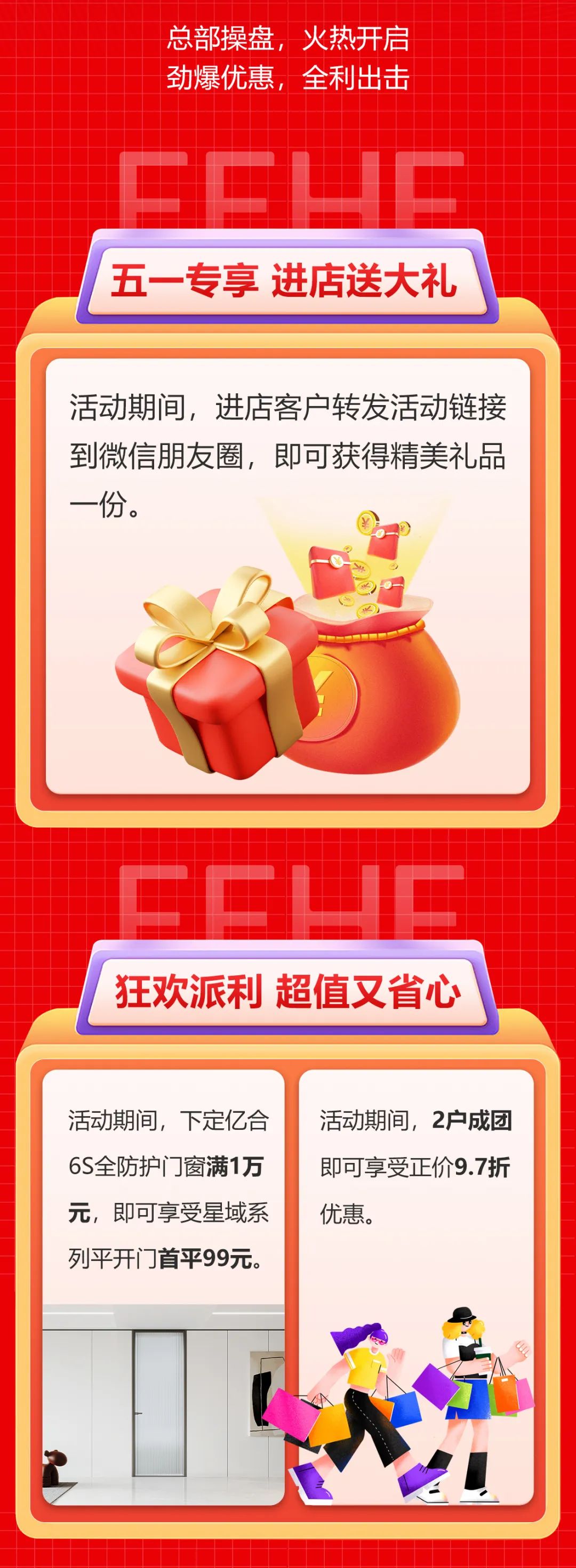 活動期間,下定億合6S全防護門窗滿1萬元,即可享受星域系列平開門首平99元。