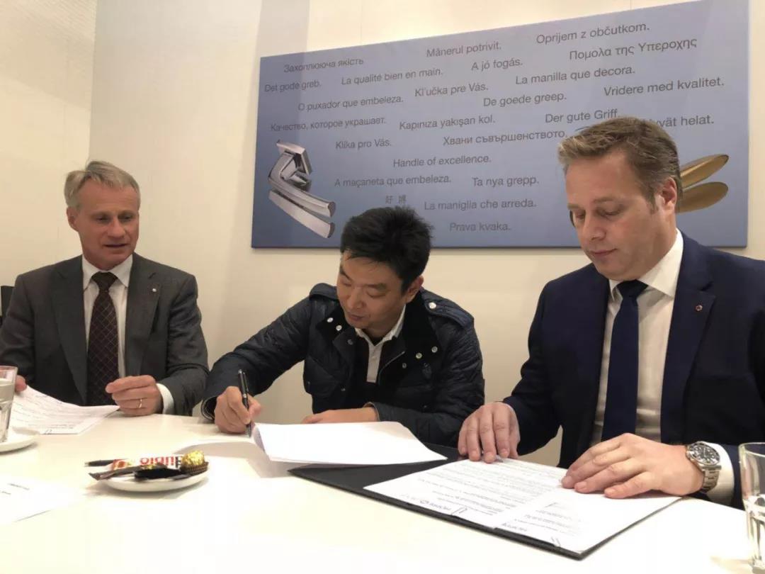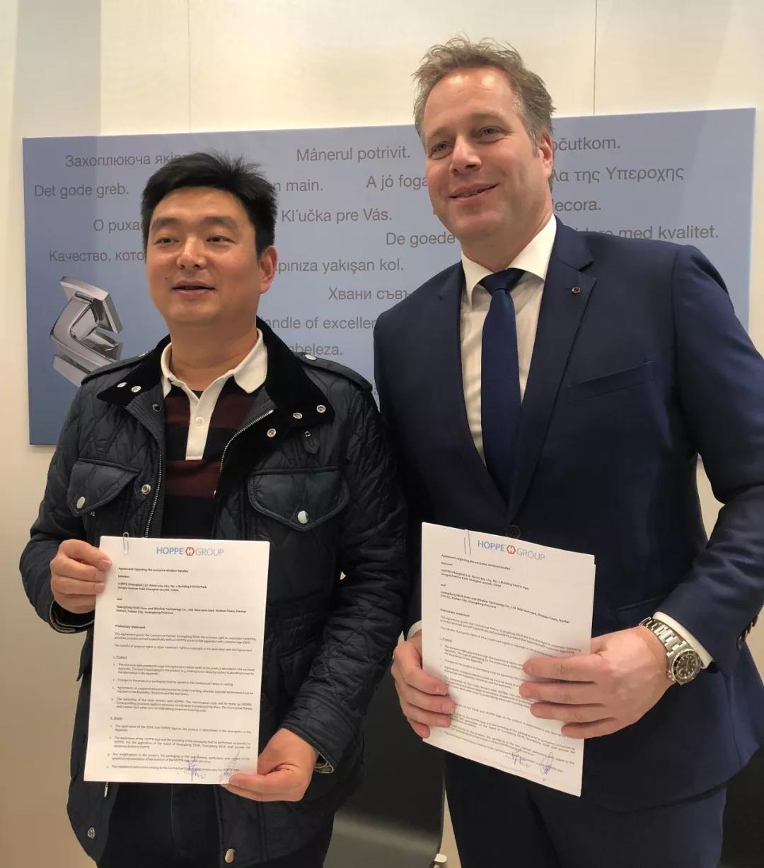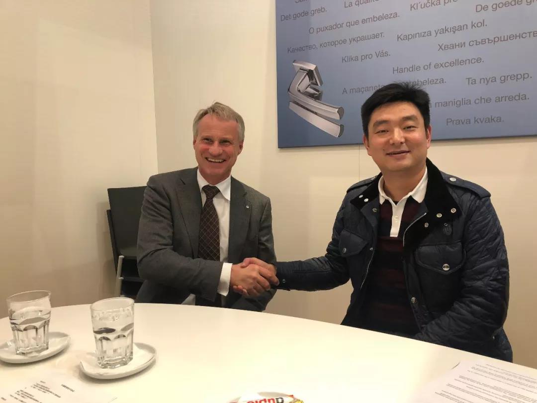 1月15日,經過充分的考察和交流,在慕尼黑展會上,廣東省門窗協會會長、億合門窗董事長曾奎先生同德國HOPPE好博集團第二代所有者Christoph Hoppe克里斯托弗·好博先生、亞太區總裁Eric Kersten先生,就定制億合專屬五金達成了合作協議,并現場舉行了簡單而隆重的簽約儀式。