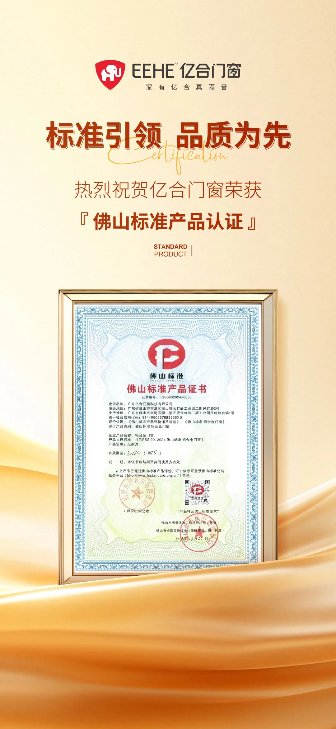 億合門窗憑借卓越的品質、前沿的創新技術、周到的服務模式以及在數字化轉型道路上的積極探索,成功入選“佛山標準”產品認證,意味著億合在產品品質、品控標準、技術創新、管理體系等方面已走在國際、國家標準前列,成為中國門窗產品的重要代表之一,廣受無數消費者和合作伙伴的喜愛與好評。