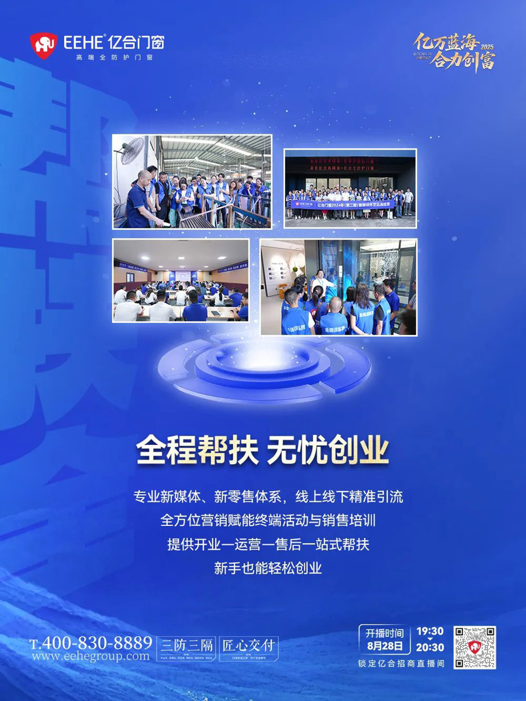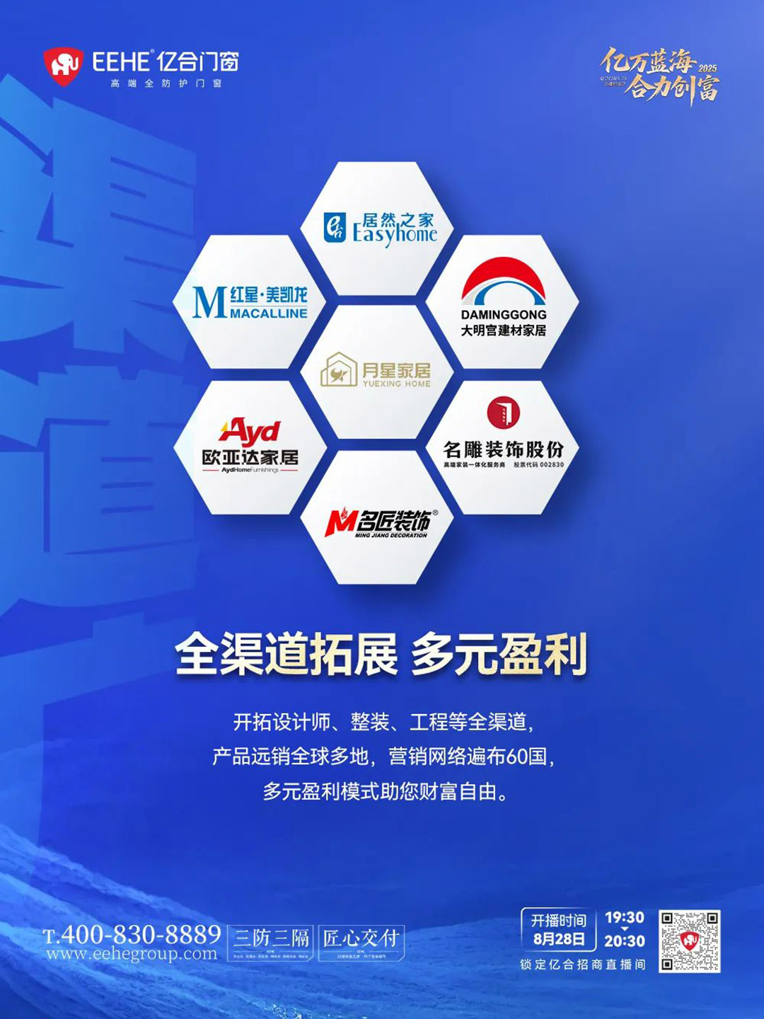 8月28日晚上19:30—20:30的直播招商會,將是一次不容錯過的財富機遇。在這場直播中,您將深入了解市場前景和億合門窗的品牌理念、產品優勢、加盟政策。無論您是初入行業的創業者,還是尋求轉型升級的門窗從業者,億合門窗都將為您提供一個實現財富夢想的平臺。抓住時代機遇,開啟全新財富之路,億合門窗誠邀您掃二維碼預約,提前鎖定“億合門窗”官方視頻號直播間,共同搶占萬億門窗市場,共創財富未來!
