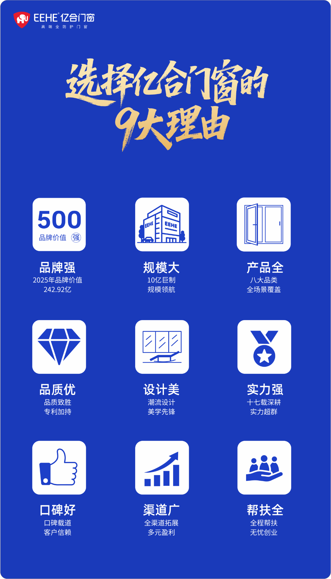 在行業大勢下,億合門窗以敏銳的市場洞察力,始終走在行業前沿。攜手億合門窗,意味著加盟商能夠率先掌握行業動態,同時憑借億合門窗品牌強、規模大、產品全、品質優、設計美、實力強、口碑好、渠道廣、幫扶全的九大核心優勢,在當地門窗市場中搶占先機,實現彎道超車,在這片萬億藍海中站穩腳跟。